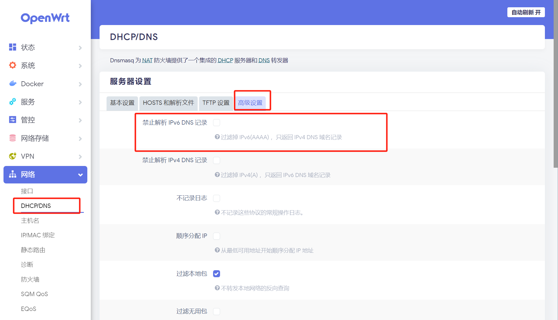 ▼ 打开OpenWRT的网络 -> DHCP/DNS -> 高级设置,如下图所示设置