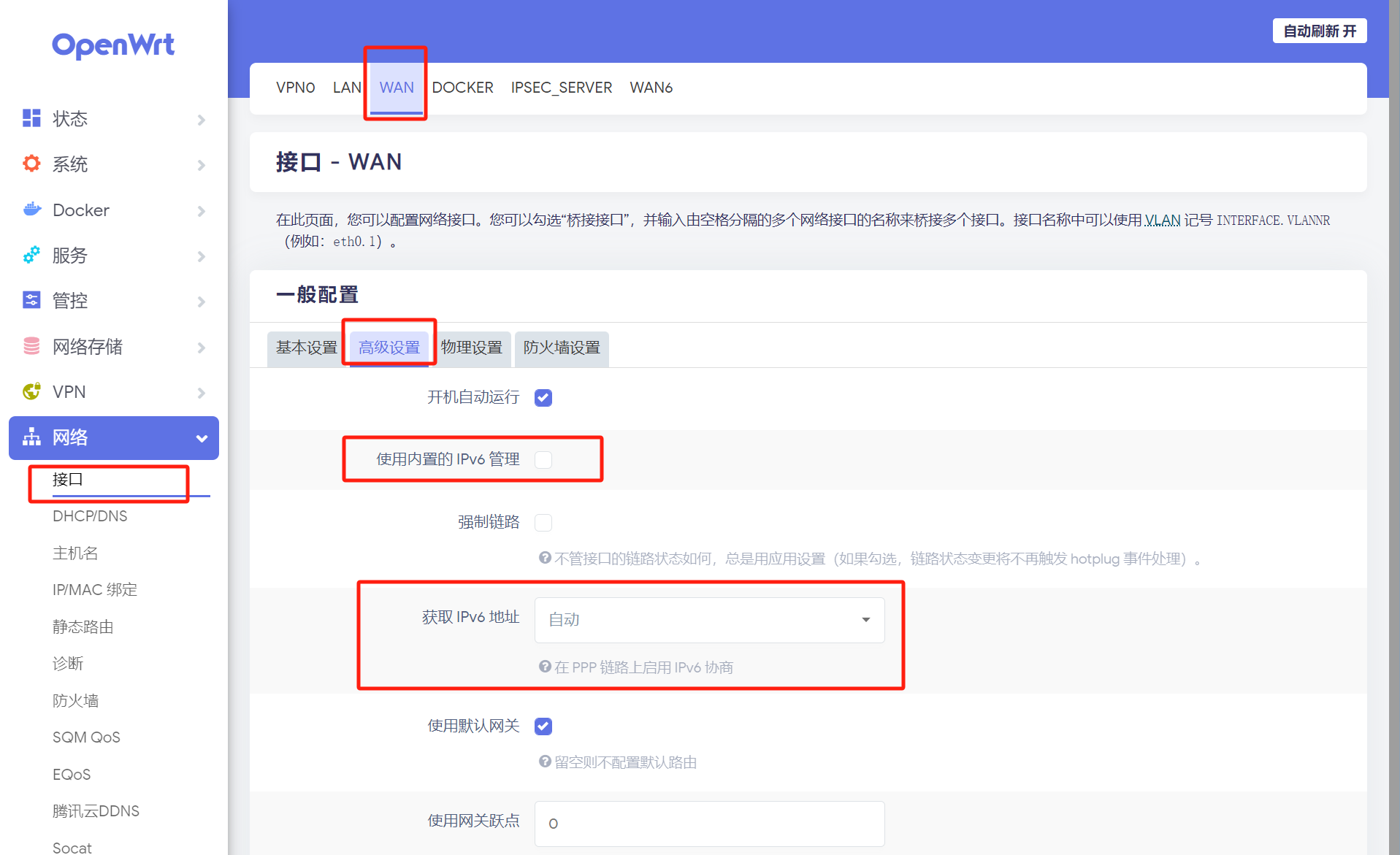 ▼ 打开 网络 -> 接口 -> WAN -> 高级设置,如下图所示设置,保存应用