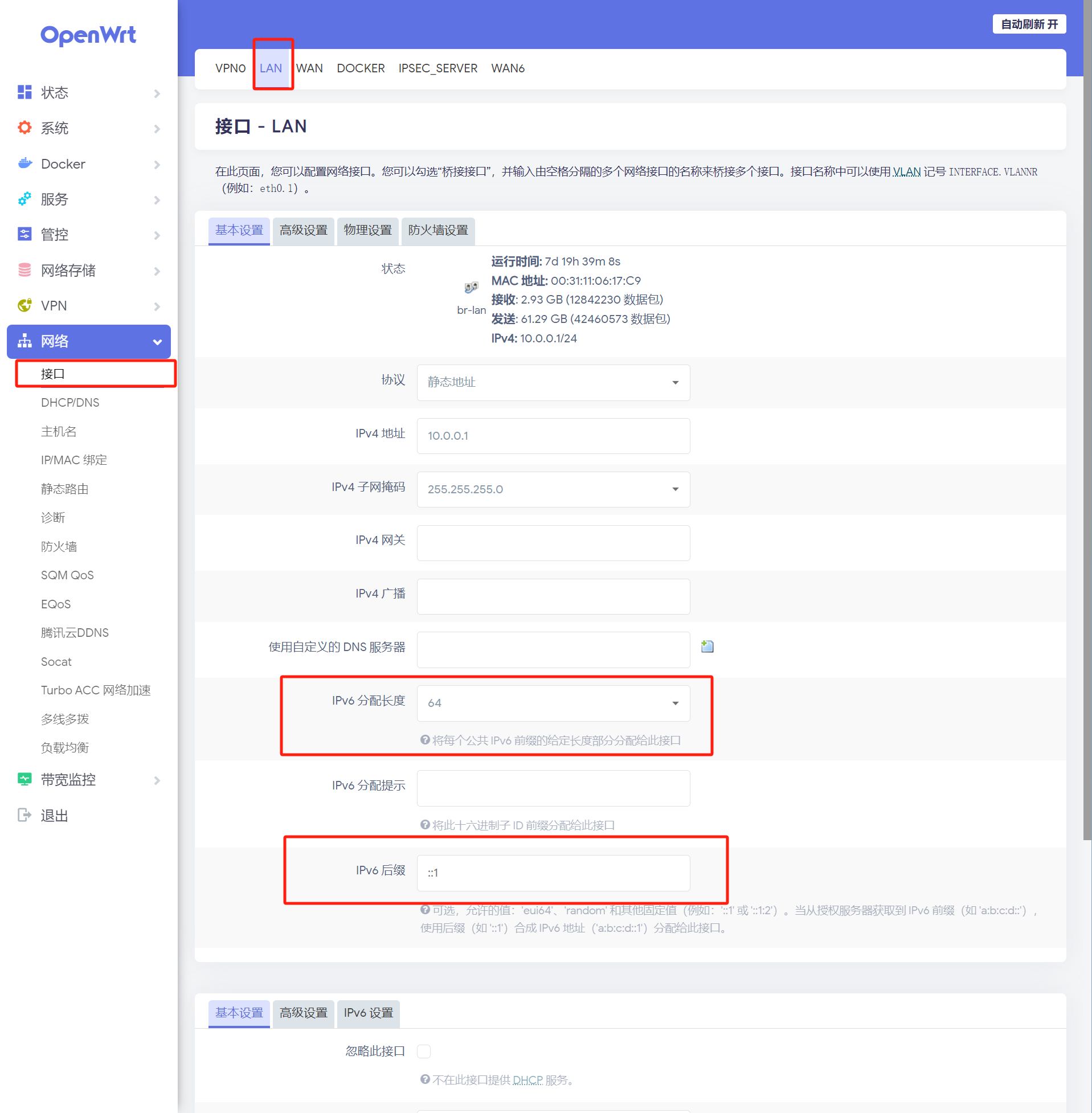 ▼ 打开 网络 -> 接口 -> LAN -> 基本设置,IPv6分配长度设置为64,IPv6后缀设置为 ::1