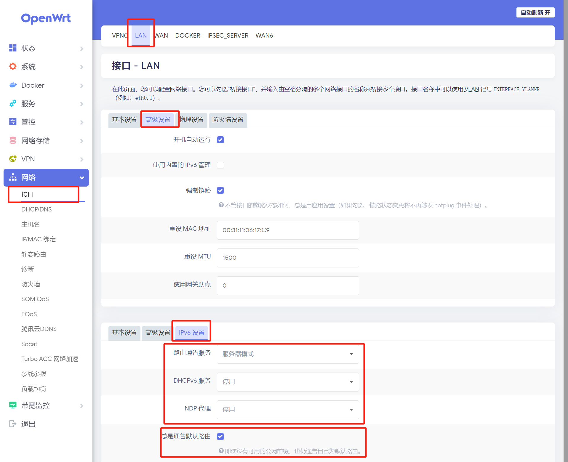 ▼ 打开 网络 -> 接口 -> LAN -> 高级设置,IPv6设置,如下图所示。注意路由通告服务,设置服务器模式(适用于OpenWRT作为主路由的方式),设置完成,保存并应用